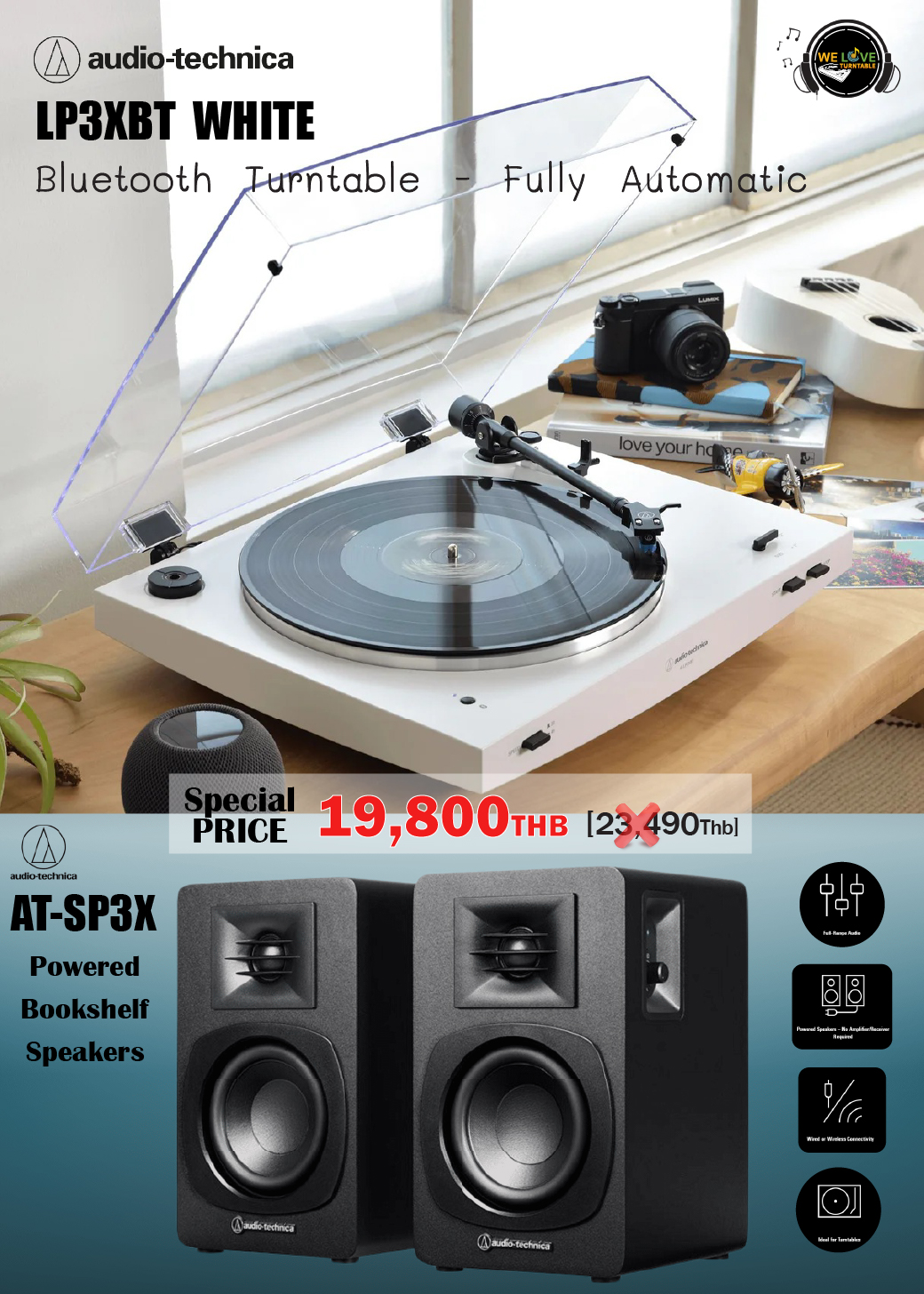 เครื่องเล่นแผ่นเสียง Audio Technica AT-LP3XBT White + ลำโพง Audio Technica AT-SP3X (New)