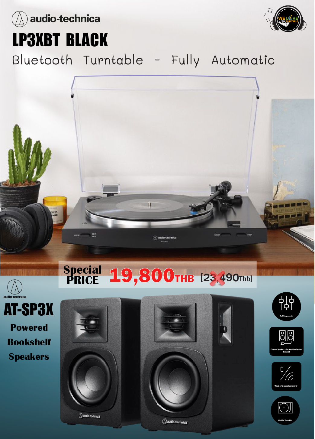 เครื่องเล่นแผ่นเสียง Audio Technica AT-LP3XBT Black + ลำโพง Audio Technica AT-SP3X (New)