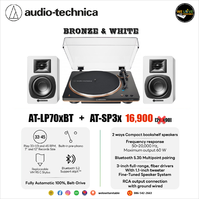 เครื่องเล่นแผ่นเสียง Audio Technica AT-LP70XBT Bronze + ลำโพง Audio Technica AT-SP3X White (New)