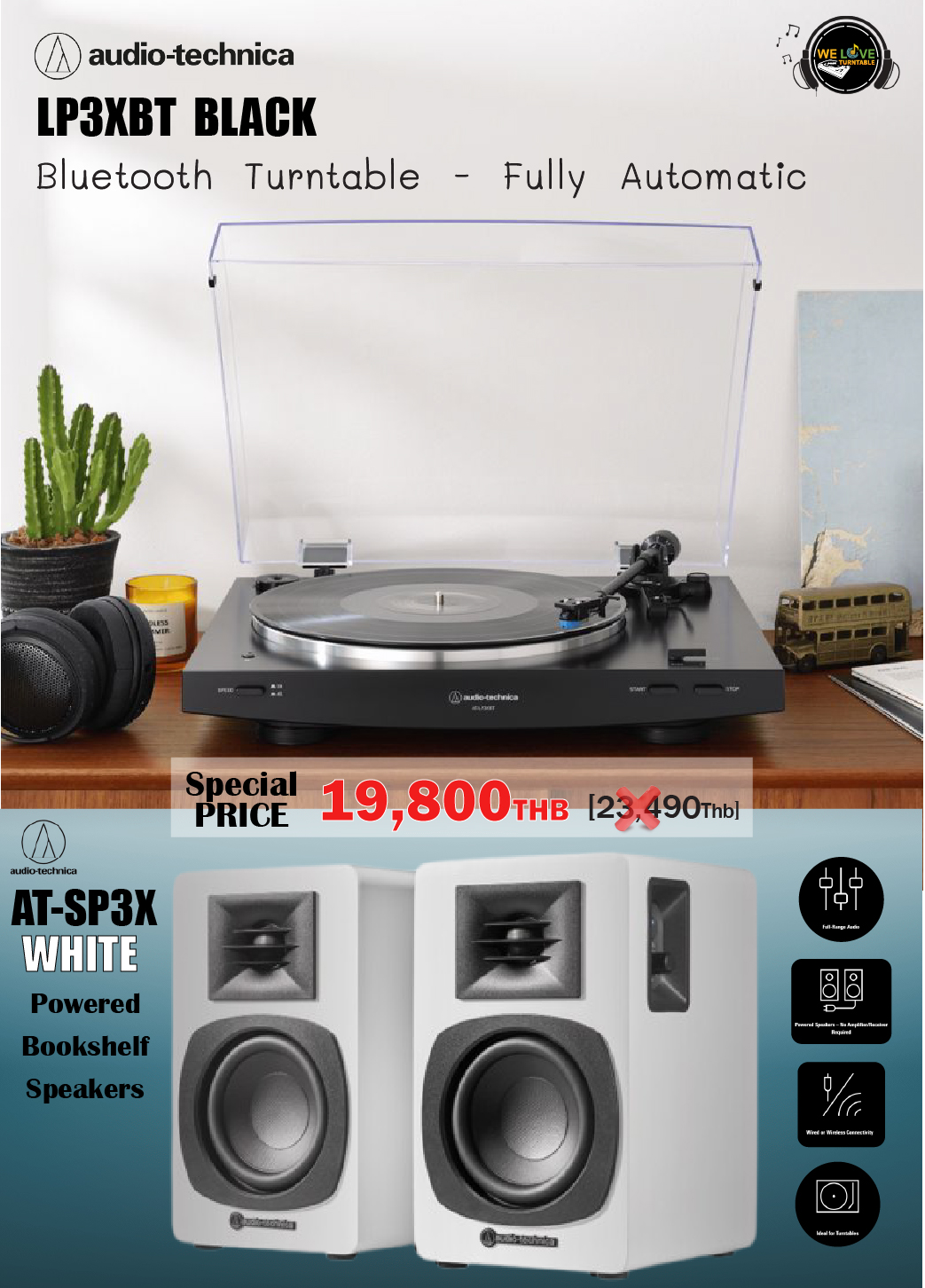 เครื่องเล่นแผ่นเสียง Audio Technica AT-LP3XBT Black + ลำโพง Audio Technica AT-SP3X White (New)